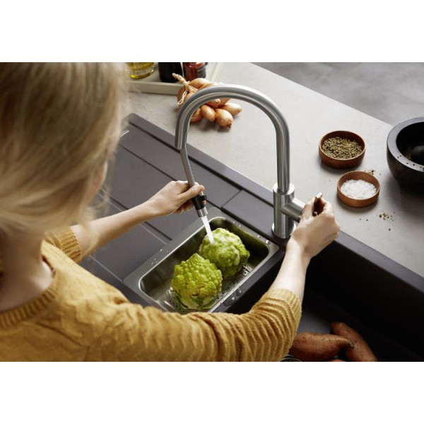 Slavina klasičnog zaobljenog oblika, inox massive površine i sa crevom na izvlačenje.